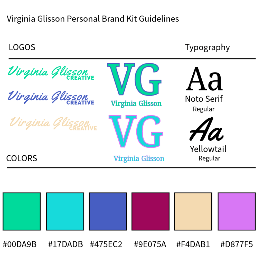 When creating my brand kit and brand suite, I knew I wanted my colors, fonts, typography, and images to best reflect my personality and who I am in a unique way. I used Adobe Express and Adobe Illustrator to help build my brand suite.
